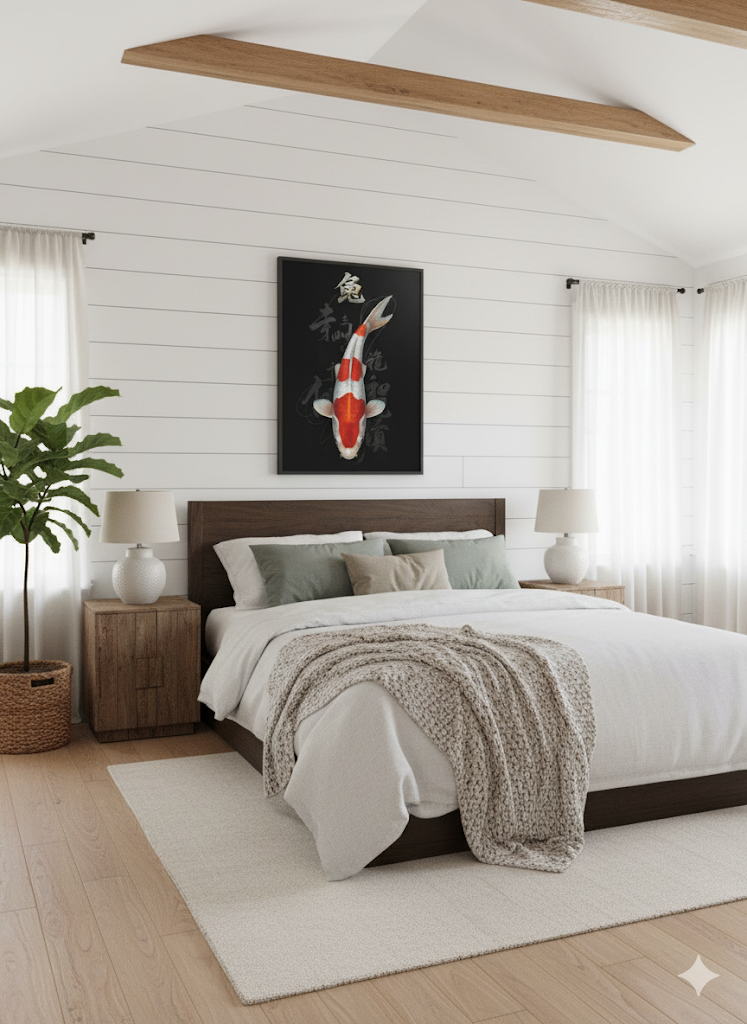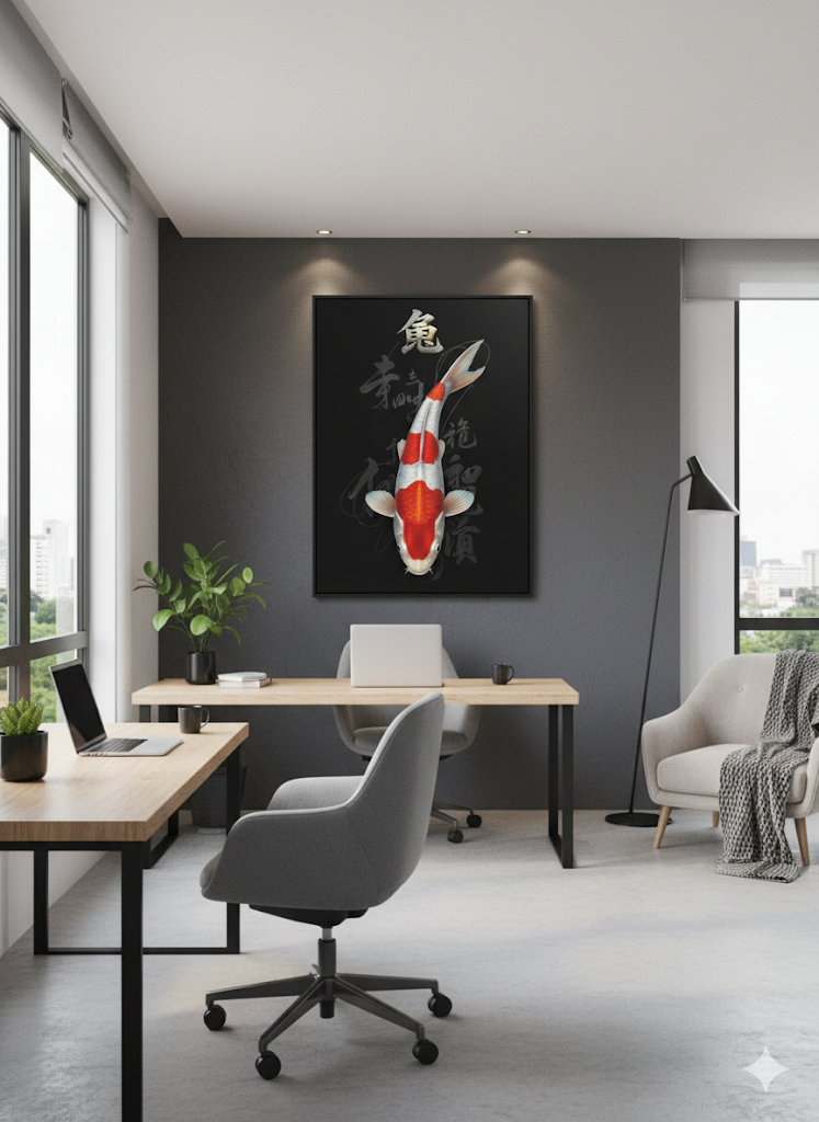 Design: Ein majestätischer Koi-Karpfen in lebendigen Rot- und Weißtönen, umgeben von traditioneller Kalligraphie auf dunklem Hintergrund.